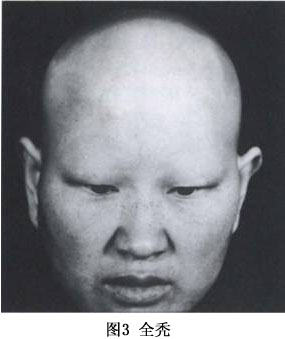 斑秃的发病率男女大致相等,但在儿童和青年人中比较常见。斑秃亦可见于眉毛、睫毛、腋毛、阴毛及胡须等,且有可能是惟一的受累部位。多数斑秃患者仅有1片或数片脱发区,病程数月。但也有少数患者可反复发生或边长边脱落。重者脱发持续进行,脱发区彼此融合,渐成为大片状的脱发,病程可持续数年。若头发全部脱落,称全秃(alopecia totalis)(图3)。若头发、眉毛、睫毛、胡须、腋毛、阴毛及毳毛等所有毛发均脱落,称普秃(alopecia universatis)。沿头皮周缘呈潜行性的带状脱发称为匍行性脱发(ophiasis)。
