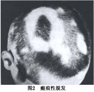 患处有瘢痕、毛囊破坏、永久性秃发。还可见各种病因的相应临床表现。如红斑狼疮引起的可见红斑狼疮的其他皮肤表现及组织病理、实验室检查改变等。斑秃多系突然发生,表现为头皮出现圆形或椭圆形的脱发斑。由于无自觉症状,故常在无意中和被他人发现,也有在梳头时注意到大量头发脱落,才发现片状脱发区。本病可分3个期,即进行期,静止期及恢复期。在进行期,出现新的脱发斑,原脱发斑扩大,但脱发斑的数目、大小不一,多为甲盖至钱币大小,毗邻的脱发斑可以迅速融合。脱落的发干近端萎缩,无光泽,末端粗黑。脱发斑周缘的头发松动,易于拔下,发根成感叹号形(!),即拔发试验阳性(图1,2)。这是疾病处于进行期的一个特征。脱发区的头皮正常,无炎性发红、无鳞屑、无瘢痕。静止期脱发区边缘的头发不再松动,无新的脱发斑出现。大多患者在3~4个月的静止期过后,进入恢复期。恢复期有新毛发长出,最初为细软色浅的绒毛,类似毳毛,时久渐变粗变黑,然后恢复正常。