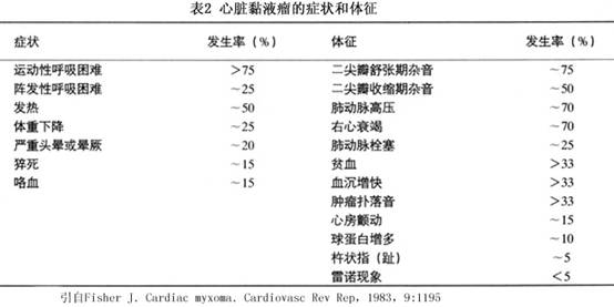 1.全身症状 由于黏液瘤自身的出血、变性、坏死,可引起发热、贫血、乏力、关节痛、荨麻疹、食欲差、体重下降,甚至呈恶病质。尤其是左房黏液瘤,可引起左房扩大压迫食管,使进食受梗。瘤体堵塞肺静脉,可引起反复咯血。尚有血沉增快、血清蛋白电泳异常(白蛋白降低,球蛋白增高)。国内有血沉记录的243例中增快者192例(79.0%),一般第1h在30~70mm,平均32.2mm。活动性头晕、疲乏、气促是最通常症状。免疫学检查研究发现,黏液瘤病人出现症状时,抗心肌抗体效价增高,肿瘤切除后效价降低。常见的这些全身症状可能诊断为胶原性血管疾病。但也有少数黏液瘤病例由于合并细菌性或真菌性感染所致。Fisher将心脏黏液瘤的症状、体征和发生率归纳如表2。