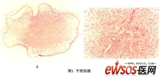 血管平滑肌瘤,常有完整包膜,瘤内含有很多较大的血管,这些血管不含弹力膜(图1)。